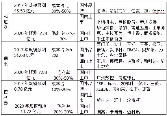 数据显示,在工业机器人的总成本中,三大关键部件约占机器人总成本的80%左右。其中,减速机占比最高,约为33%~38%,驱动及伺服电机约占20%~25%,控制器约占10%~15%,机器人本体在总成本中占比只有20%左右。目前除了本体以外,我国工业机器人核心零部件大部分依赖进口。