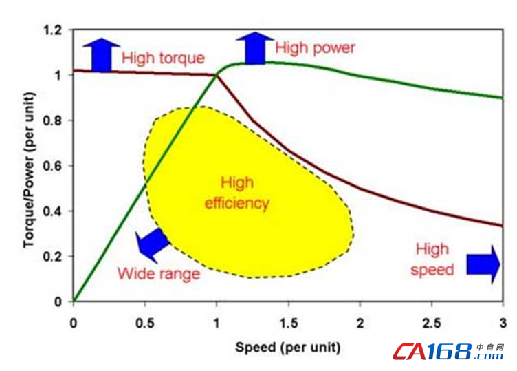 上面这个图就是电动机的外特性曲线,其中红色线是扭矩输出特性,绿色线是功率输出特性,而黄色的部分就是电动机运行比较高效的区间。