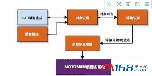 图3所示为一个虚拟系统流程图,显示了系统如何从图像传感器收集数据。视觉数据和CAD模型数据被搭配使用,用来确定对象列表,对象列表随后被发送给焊接识别模块,然后采用人工智能技术明确焊接要求。