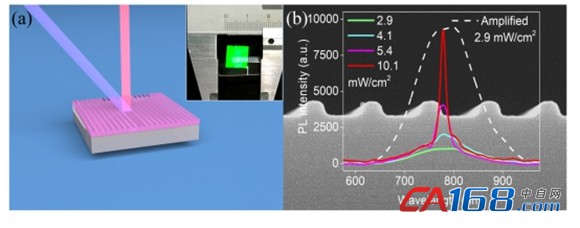 (a)DFB全硅激光器的光泵浦和发光示意图;插图:DFB激光器件的实物照片。(b)样品的PL谱随泵浦功率的变化;背景:DFB结构的横截面SEM图像