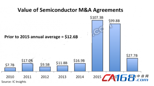 2015年和2016年,大大小小的并购活动席卷整个半导体行业,并购金额创下历史新高。进入2017年,并购行为大幅度减少,尽管如此,根据ICInsight本月发布的最新报告,2017年的并购交易金额仍然是2010-2015年间平均并购交易金额的两倍多。