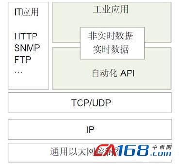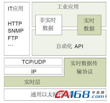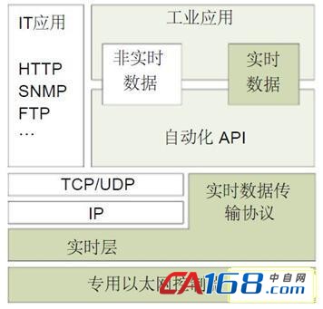 第二类:采用通用硬件和定义实时数据传输协议。EthernetPowerlink、PROFInet/RT采用这种方式。采用通用以太网控制器但不使用TCP/IP协议来传输实时数据,而是定义了一种专用的包含实时层的实时数据传输协议,用来传输对实时性要求很高的数据,TCP/IP协议栈可能依然存在,用来传输非实时数据,但是其对以太网的读取受到实时层的限制,以提高实时性能。这种结构的优点是实时性较强,硬件与通用以太网兼容。