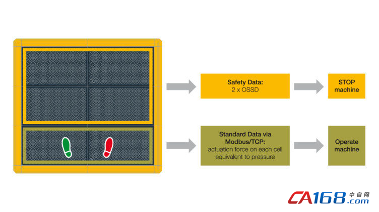 当有人进入到危险区域,安全地毯能够使设备减速或者停止(等同于进入保护)并且提供后部区域的保护。毕竟,不仅仅需要对进入危险区域进行监控,危险区域后面的区域也需要进行监控,从而防止设备的非正常启动。