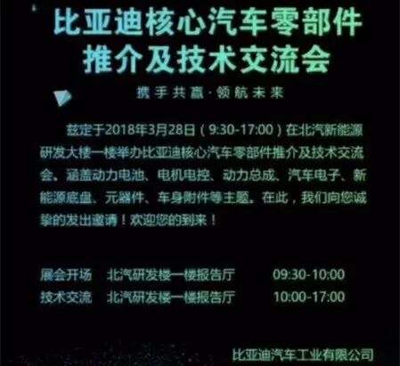 比亚迪是业内公认的电动先驱。2017年,比亚迪新能源汽车销量11.37万台,再夺冠军,但纯电动车冠军被北汽新能源夺得,销量10.32万台。3月28日,比亚迪将举行一个核心汽车零部件推介及技术交流会,推介电池、电机、电控和底盘等核心技术。有意思的是,活动地点选择在了北汽新能源研发大楼一楼。