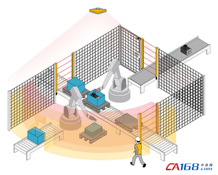 皮尔磁的SafetyEYE的配置工具,可以方便地在确定的危险区上或者周围进行虚拟的警告和保护区域的设置。当进入到设置的警告区域(黄色区域),并不会对操作人员产生危险,但是,会有警报灯和/或者声音的信号预示着有工人正在进入安全相关区域。因为有了警报,可以提醒工人调整自己的操作行为,与此同时,机器是继续运行的。只有当SafetyEYE检测到有人或物体进入到标记为红色危险区域时,安全软件才会触发相应的安全操作:系统或者子系统停止运行,并且驱动器进入一个减速的安全模式;同时,红色的警报灯亮起,警报声响起。在系统或子系统重新进入生产模式之前,工人必须离开安全相关的区域,告知已了解现在的模式,并且激活重启。