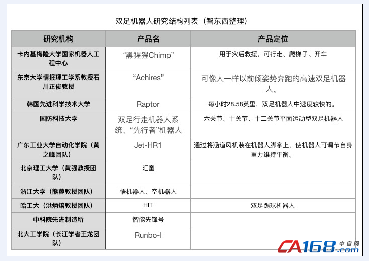 在研究方面,美国和日本的双足机器人研究起步较早,目前机器人的稳定性已不成问题,主要在行动速度加大研究。如卡内基梅隆大学的国家机器人工程中心,就曾研究出一款名为“Chimp”的黑猩猩机器人,可实现行走、爬梯子甚至是开车等功能,可用于灾后救援。中国的双足机器人研究也非常火,浙大熊蓉教授就曾带队研发出“悟”“空”两台双足机器人,而她们的团队还在今年2月,研发出四足机器人“绝影”。此外,北大工学院、哈工大、北京理工大学等国内知名大学都有团队进行双足机器人的研究。