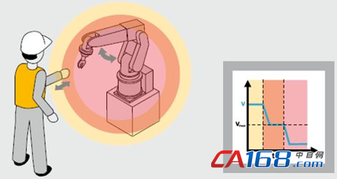根据人员和机器人之间的距离,系统通过控制机器人的速度产生相应变化,最终在碰撞产生之前停止机器人。当操作员离开时,机器人系统可以根据需要手动或自动恢复原有运动路径,同时保持最小的距离间隔。