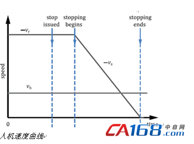 在上面的人机速度曲线图中,系统在发出停机指令到机器人接收指令之间具有一段响应延迟;同时机器人开始减速到停机同样也具有相当的时间间隔。因此包含机器人系统响应时间及停止距离 (sr, ss) 以及操作员与机器人系统的位置不确定性 (zd, zr)都应当经过评估。