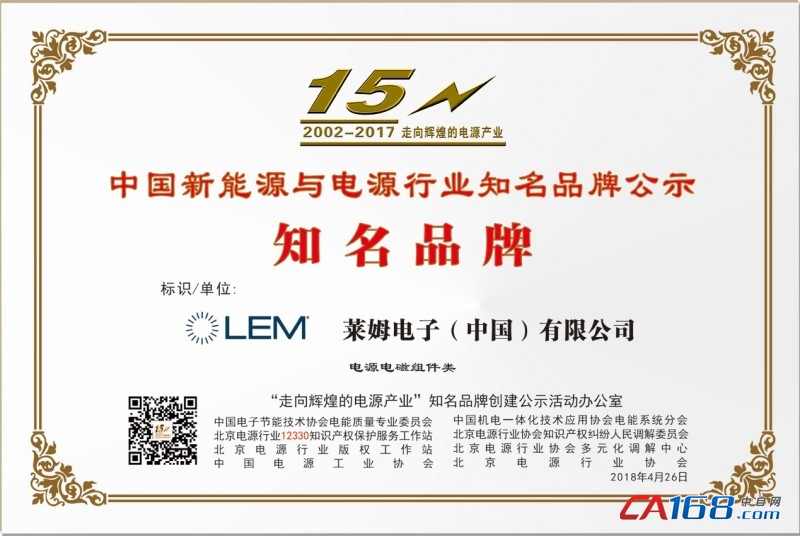 莱姆电子荣获中国新能源与电源行业知名品牌公示知名品牌奖