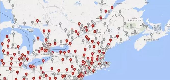 但是当你放大的时候,你会看到和以前相同的用户界面,其中计划建设的超级充电站以灰色显示,而已经投入使用的依然显示为红色。图中是美国东北部和加拿大东部的超级充电站分布图:当你点击灰色充电站时,可以向你显示更多细节,比如它将何时投入使用。