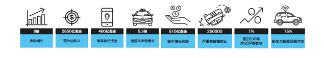 全球出行市场将呈爆炸式增长,预计到 2030年全球出行市场将呈现8倍增长,预计收入高达2850亿美金,每年旅行支出在480亿美金左右,出租车市场将增长5.3倍,我们正在拥抱一个建立在 APP上的新出行生态。我国政府也将智能网联汽车置于战略优先地位,到 2030年,我们每年的增长价值为510亿美金,预防严重事故约25万起。智能汽车市场到2030年对GDP的影响约为1%,并且将会有15%的新车为智能联网汽车。
