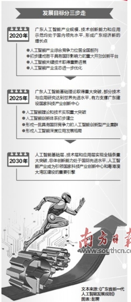 日前,《广东省新一代人工智能发展规划》(下称《规划》)印发实施,积极谋划新一代人工智能产业在时间和空间上的系统性战略布局,明确分三步走,逐步将广东打造成为国际先进的新一代人工智能产业发展战略高地,为打造国家科技产业创新中心、实施粤港澳大湾区建设战略、奋力实现“四个走在全国前列”提供强大支撑。