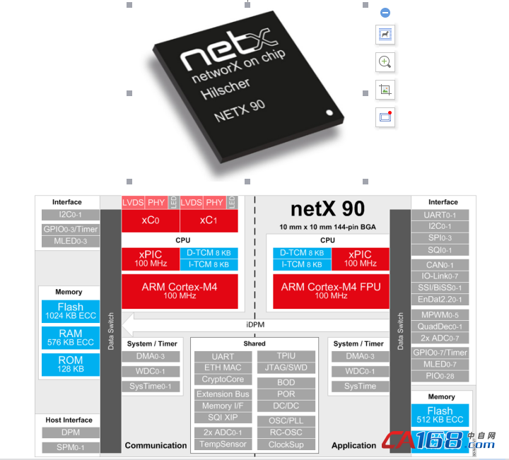 在netX90 SoC中集成了两个独立ARM®Cortex®-M4处理器内核,其中一个用于实时通讯,另一个可实现用户应用程序的开发,两个CPU之间的数据交互基于双端口内存iDPM结构,有统一的API接口,便于开发人员实现驱动的移植和应用程序的开发。此外,还集成了DC/DC转换器,具有片上BOD和POR电路,可简化和优化硬件设计。快速以太网PHY、模拟/混合信号IP以及片上闪存和SRAM的集成,可显著节省BOM成本。
